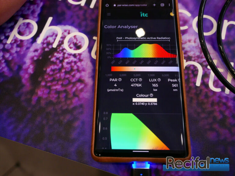 Le PARwise est un appareil d’analyse de lumière. Premier paramètre donné : le spectre. Il s’agit d’une interpolation sur plusieurs points de mesures et non un spectre mesuré complètement sur cet intervalle. Il en donne l’intensité : le PAR (radiations actives pour la photosynthèse), ou le lux, unité d’intensité moins pertinente pour les coraux car elle inclut une notion de perception par l’oeil humain. Vous avez également accès à la température d’éclairage en Kelvin (lorsque celle-ci est mesurable), la longueur d’onde du pic d’intensité dominante, et la DLI (Daily Light Integral), correspondant à la quantité de lumière sur un m2 sur la journée.