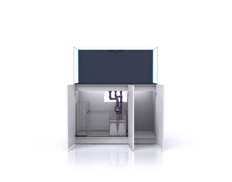 Côté technique, la circulation est assurée par un système de tuyauterie complet et silencieux. Une pompe de remontée (non fournie) de 2 000 L/h est recommandée. La décantation dispose d’un compartiment d’arrivée d’eau, un filtre micron bag, un compartiment pour écumeur et réacteurs au niveau constant, un piège à microbulles et un compartiment de remontée. A noter qu’une réserve d’eau osmosée est également fournie, et que celle-ci est indépendante de la décantation ce qui lui permet d’avoir un volume conséquent.