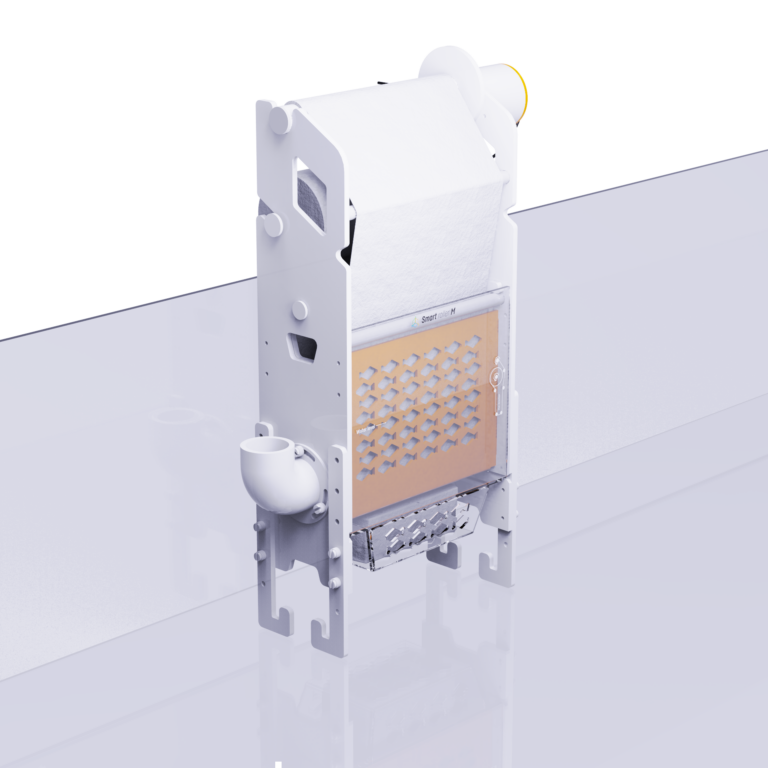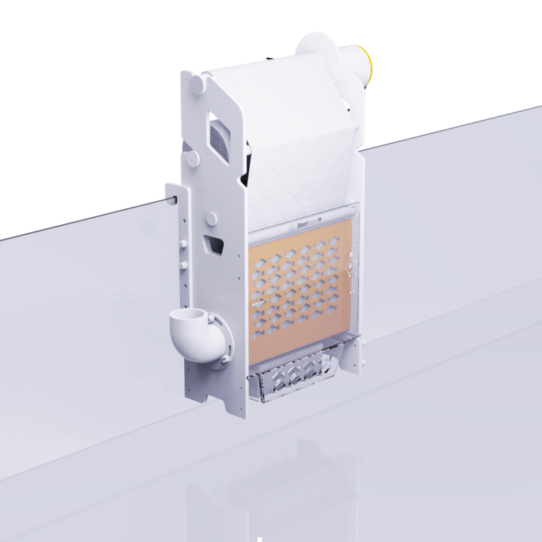 Les Smart Roller s’accrochent sur les vitres de votre cuve de filtration, ou se pos au fond grâce à des pieds latéraux. L’eau filtrée coule sur un panier pouvant contenir une résine, du charbon ou un média de filtration biologique par exemple. Sur les côtés, une trape amovible permet de laisser couler de l’eau qui ne sera alors pas filtrée, ainsi qu’une autre fenêtre haute qui sert de débordement de sécurité en cas de dysfonctionnement du capteur et/ou du moteur. L’arrivée d’eau se fait par un coude latéral orientable en 40 mm.