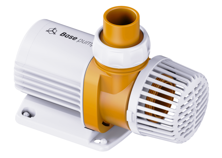 Quatre modèles de pompes connectées Reef Factory Base Pump sont proposés : 5 000, 8 000 , 10 000 et 13 000. Les références correspondent au débit maximal de chaque modèle. Ces pompes s’inscrivent dans le reste de la gamme Reef Factory avec un design blanc et jaune. On remarque la présence de patins, qui, en plus du fonctionnement DC, annoncent un fonctionnement silencieux et pour une consommation électrique raisonnable.