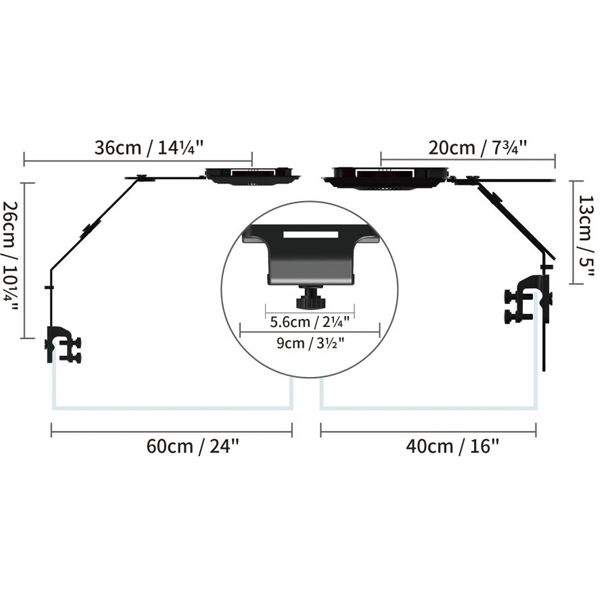 De l’extérieur, rien ne distingue la L165 de la L165B. Ce sont des rampes compactes (22 x 17,6 x 3,2 cm), élégantes avec une finition noire. Elles disposent de 6 clusters de 4 LED dont 6 multichips, un ventilateur central. Elles sont livrées avec un pied d’accroche permettant de les installer sur votre aquarium et qu’il est facile d’ajuster en hauteur et largeur pour correspondre à votre aquarium.