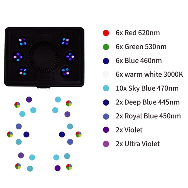 En effet, les 2 LEDs de blanc froid ainsi que 2 bleu profond (445 nm) présentes sur l’autre modèle sont remplacées par 4 de couleur bleu « cyan » (470 nm). Le bleu 470 nm étant mieux perçu par l’oeil humain que le 445 nm et renforçant la fluorescence de certains pigments contenus dans les tissus des coraux.