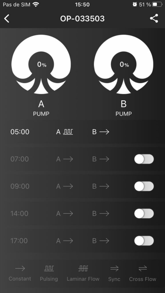 En plus du contrôle par le boîtier, vous pouvez désormais connectez les Octo Pulse + à votre Smartphone et les programmer grâce à l’application Octo Aquatic (iOS et Android). Elle s’installe simplement depuis les app stores correspondant, ou grâce aux QR codes présents sur le côté de la boîte (oups, je les avais pas vus à la première installation !).