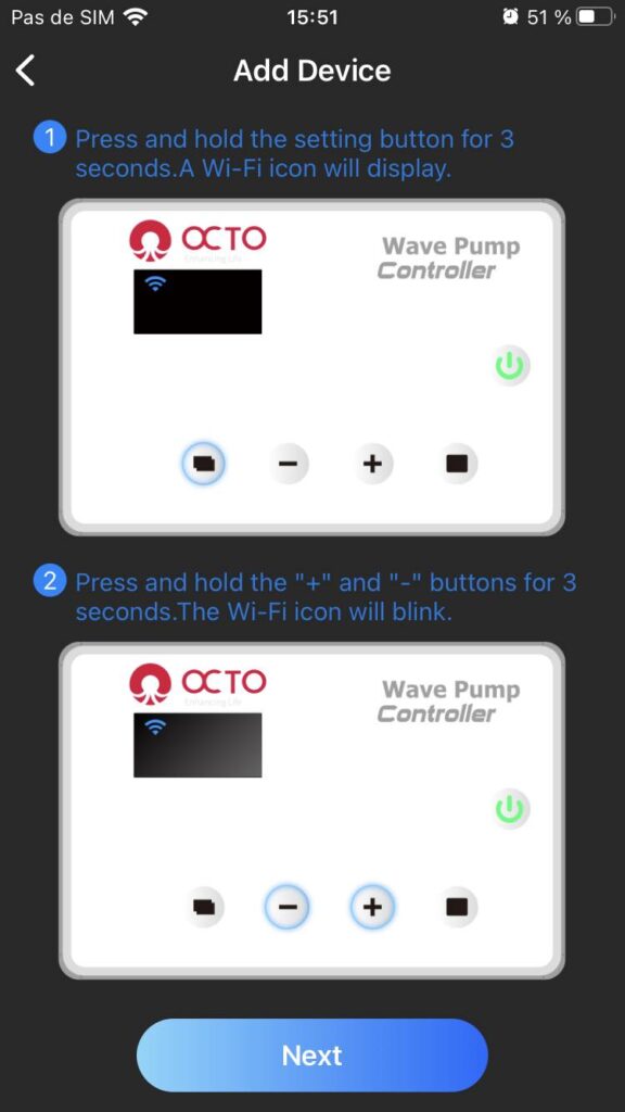 En plus du contrôle par le boîtier, vous pouvez désormais connectez les Octo Pulse + à votre Smartphone et les programmer grâce à l’application Octo Aquatic (iOS et Android). Elle s’installe simplement depuis les app stores correspondant, ou grâce aux QR codes présents sur le côté de la boîte (oups, je les avais pas vus à la première installation !).