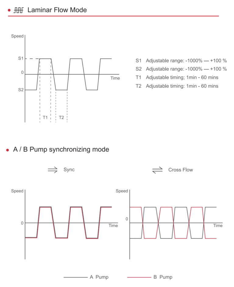 Le mode laminaire consiste également en la variation entre 2 débits, mais sur un temps plus long, à l’échelle de la minute (1-60 min). Ce mode permet également un contre-courant, avec un fonctionnement inverse et donc une poussée de l’eau vers la vitre. Cela a pour avantage de remuer l’angle où se situe la pompe par exemple et de faire des cycles de balancement.