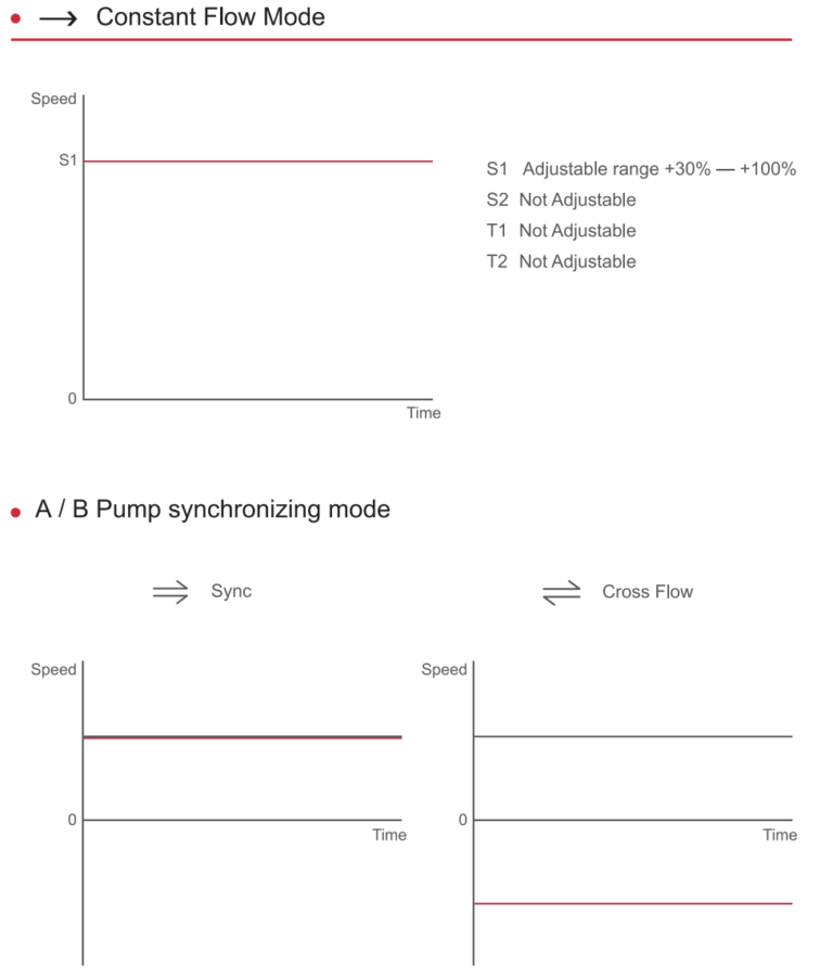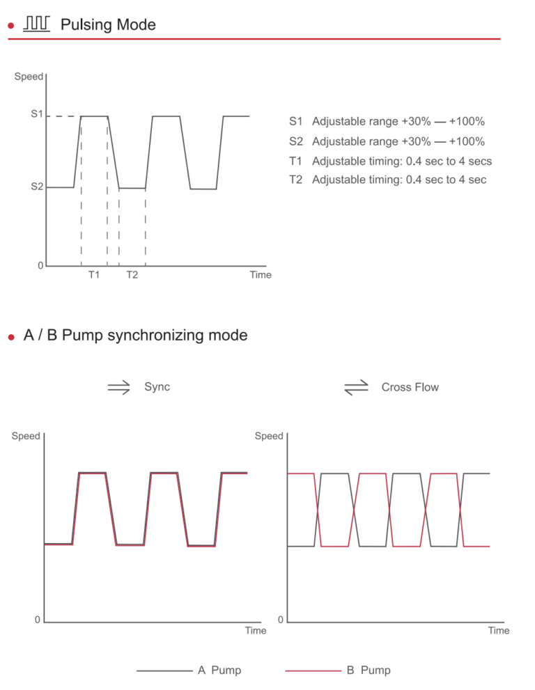 A ces 3 modes s’ajoutent la possibilité de syncrhoniser ou mettre en opposition les 2 pompes branchées au même contrôleur.