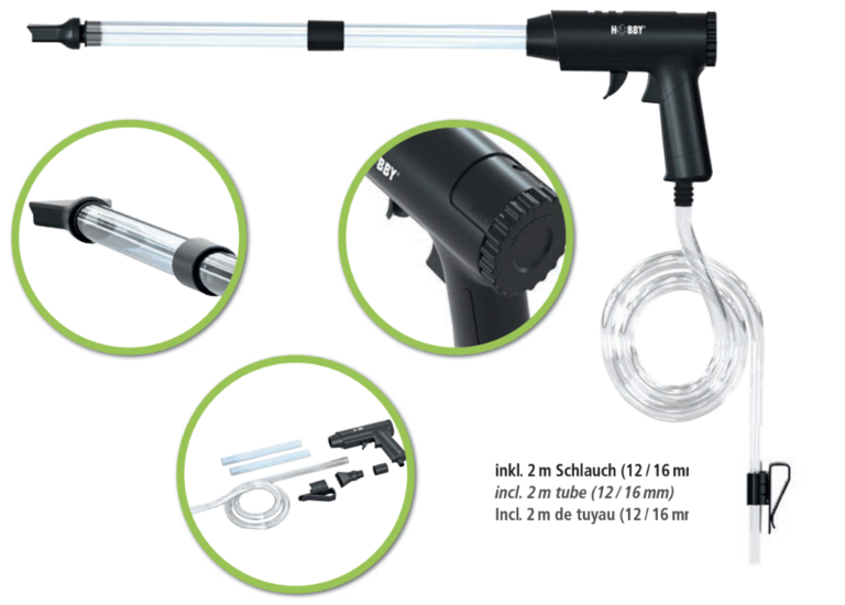 Le tuyau d’aspiration est extensible jusqu’à 50 cm de long, et 2 m de tuyau 12/16 mm sont fournis, ainsi qu’un crochet pour tenir l’évacuation à votre récipient de vidange. Si vous ne souhaitez pas changer d’eau, vous pouvez placer un micron bag en sortie de tuyau, et reverser l’eau filtrée dans votre aquarium par exemple.
