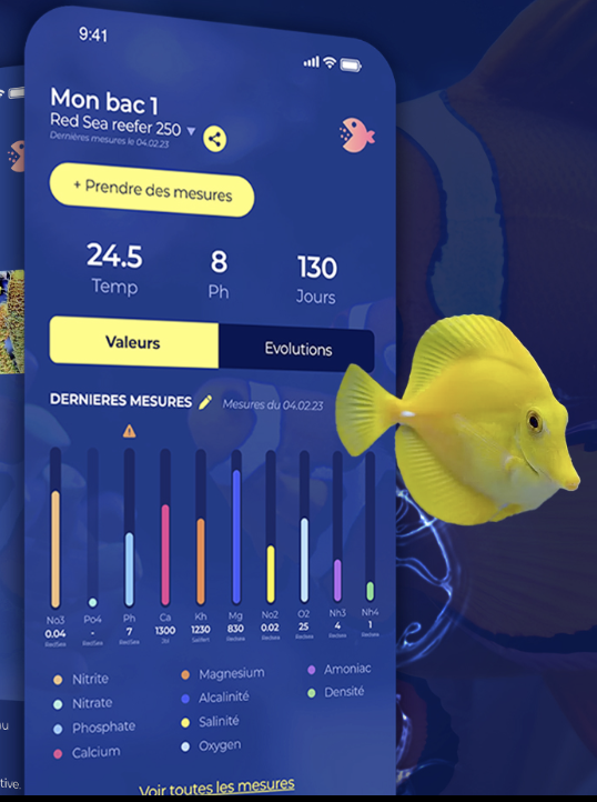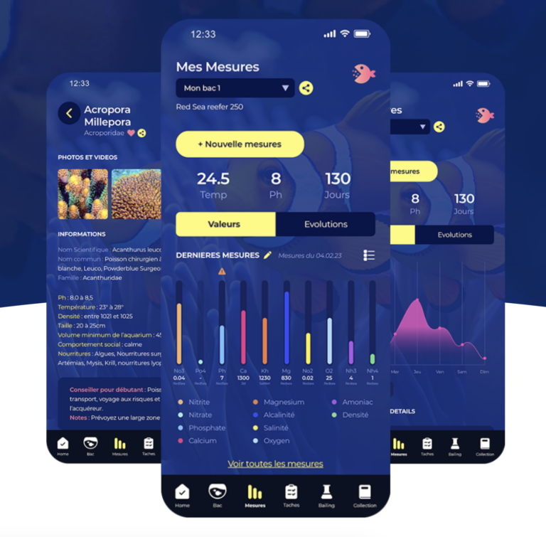 - Un tableau de bord visualisant les derniers paramètres mesurés et leur historique avec des graphiques dynamiques, élément par élément. Sur les images partagées, nous voyons : nitrites, nitrates, phosphates, pH, calcium, KH, magnésium, oxygène, ammoniac, densité. De quoi voir en un coup d’oeil les paramètres à corriger et viser une stabilité.