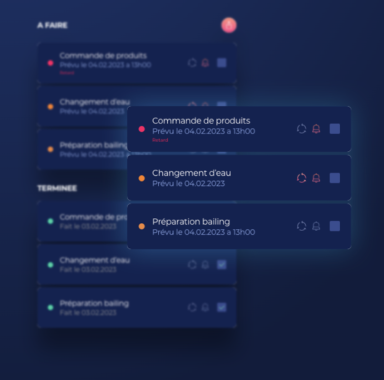 - Un agenda d’actions à faire sur son bac pour ne rien oublier, avec la possibilité de programmer des notifications. Finis les réserves d’eau osmosée et les bidons de balling vides sans s’en rendre compte, ou le retrait / non-renouvellement de résines etc.