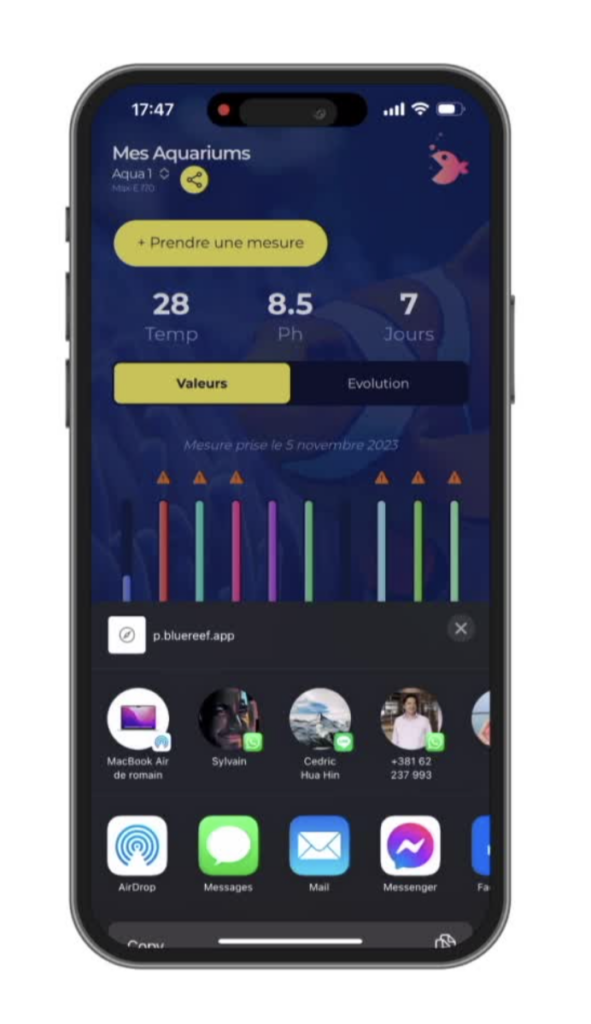 - Un système de partage facile de son aquarium, sa population, ses paramètres pour échanger sur vos expériences récifales, que le destinataire soit ou non utilisateur de l’application, et la possibilité de visionner les oeuvres de la communauté