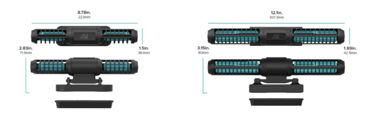- AI Orbit 4 : recommandé pour aquarium de 75 à 500 L environ, consommation maximale : 45 W, épaisseur de vitre maximale : 20 mm, dimensions (longueur x « épaisseur vitre-pompe » x hauteur) : 307 x 80 x 43 mm – Prix constaté à date de mise à jour (site de vente Allemagne) : 298,99 €