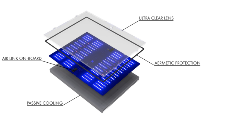 Niveau puissance, réglée au maximum, la Bluray X consomme 140 W contre 130 pour la PRO. Pour la conception, on retrouve donc les cellules LED sur un circuit électronique refroidi passivement, ce qui assure un fonctionnement silencieux. Le tout est recouvert par une plaque de diffusion épaisse et l’étanchéité entre les trois éléments est garantie par un joint faisant le tour de la rampe.