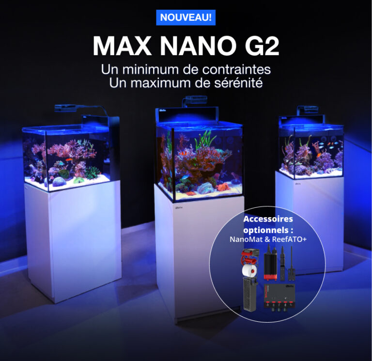 Alors que le dernier modèle, le Max Nano XL, est sorti d’office en G2, Red Sea annonce le passage des autres modèles dans cette « mise à jour » technique. En effet, dorénavant, les aquariums fabriqués seront de « G2 », ce qui implique qu’ils seront compatibles avec un filtre mécanique automatique connecté sur rouleau, le NanoMat, et le nouveau système de compensation d’évaporation connecté et qui mesure également la température, le ReefATO+. Ces 2 appareils sont à acheter séparément, mais leur installation est donc possible et simplifiée dans ces nouveaux modèles.