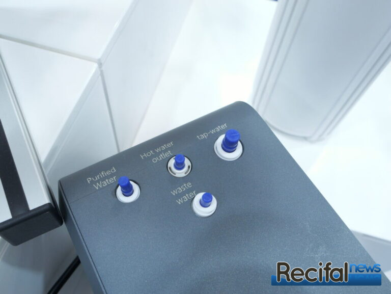 Commençons par le plus innovant. Tout d’abord, son allure de tour d’ordinateur, grise, sobre et sans fioriture permet une installation sans bricolage. Ses arrivées et sorties d’eau se font par le dessus, des boutons et écran sur le devant et l’accès à la filtration par le devant avec un simple bouton à tourner pour tirer la cartouche filtrante. Car oui, il s’agit d’une cartouche 3 en 1 (membrane, filtre fin, charbon). Côté débit, il permet la pruction de 3000 L d’eau osmosée en 24h. Mais ce n’est pas tout : ce nouvel appareil permet d’avoir de l’eau osmosée chaude ! En effet, il dispose d’une réserve d’eau interne de 4L, chauffée. Vous pourrez alors obtenir de l’eau entre 30 et 90°C en sortie. A l’utilisation, on peut imaginer un scénario comme faire dissoudre plus rapidement le sel dans de l’eau chaude, pour la diluer et obtenir de l’eau à 24-25°C prête à l’emploi par exemple.