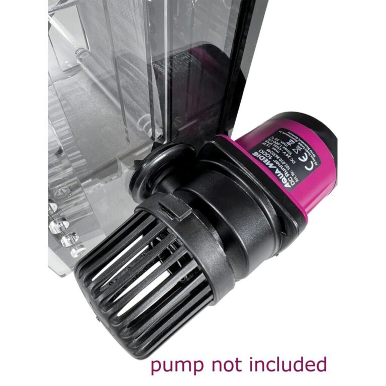 Il peut être alimenté par le tuyau de descente de l’aquarium vers la décantation grâce au raccord latéral, ou une pompe peut y être branchée directement (la marque recommande leur DC Runner 800 ou 1000) ! Pas besoin de modification de tuyauterie dans ce cas, mais la circulation à travers le filtre est indépendante du turnover entre l’aquarium et la décantation.