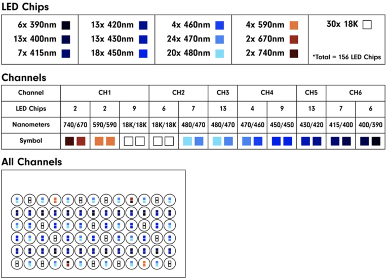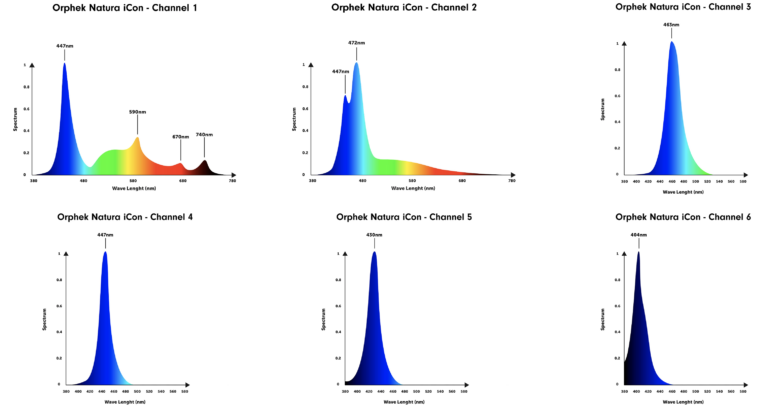 Il est possible de créer un programme personnalisé en jouant sur l’intensité des 6 canaux, dont la composition se retrouve un peu plus haut, et résumés par leur spectre ici :