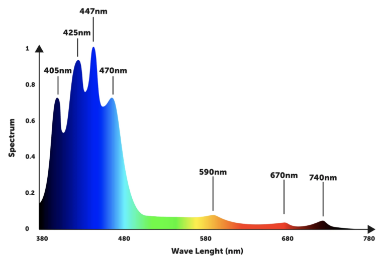 Les Orphek Natura iCon se distinguent par une grande variété de LED dans le domaine des UV-violet-bleu : 390, 400, 415, 420, 430, 450, 460, 470, 490 nm ! Le tout est complété par des LED blanches de 18 000 Kelvin, orangées à 590 nm, et rouge / infrarouge avec des LED émettant à 670 et 740 nm. Voici le spectre général :