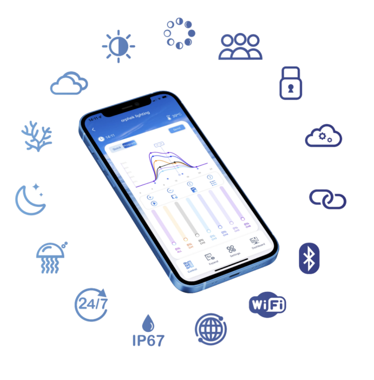 Pour ce faire, la marque a développé une nouvelle application Orphek iCon, compatible appareils iOS, Android connectés en Wi-fi ou bluetooth. Vous pourrez instaurer en plus des programmes Helius, Lunar, Sun&Moon, des programmes personnalisés et des passages nuageux par exemple. Il existe également un programme pour aquariums à méduse. Cette application est compatible avec les autres éclairages iCon de la marque dont les barres OR4, les OR3 grâce au controller Osix Smart ou Atlantik iCon.
