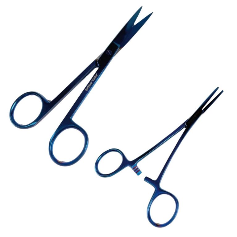 Ces outils en acier inoxydables sont recouverts d’un traitement titane bleu, augmentant leur résistance à l’eau de mer. Le tout est vendu dans une pochette similicuir pour un rangement simple et efficace.