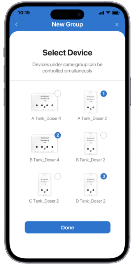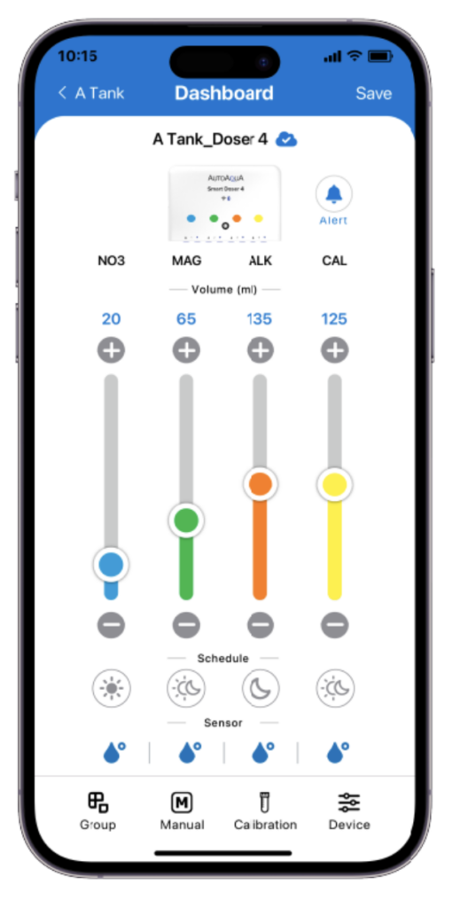 Vous pourrez piloter vos pompes, en créant un programme de dosage journalier. Il est possible de grouper jusqu’à 8 pompes pour les contrôler simultanément. Des capteurs optiques permettent de détecter lorsque les réserves de supplémentations sont vides et l’application peut vous le notifier. Vous pouvez aussi facilement étalonner les pompes, et doser manuellement depuis l’application. Un mode « alimentation » permet de couper le dosage pendant une période voulue.