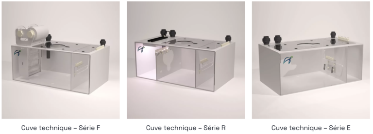 - Des décantations / cuves techniques / systèmes de filtration avec différents modèles de série, avec filtre à rouleau, refuge ou 2 compartiments simples. Elles sont équipées de couvercle percés pour laisser passer le godet de l’écumeur (ou autre appareil sur demande), de raccords-unions pour les entrées et sorties d’eau (du côté de votre choix), arrivées de tuyaux pour pompes doseuses (nombre en option), passes-câbles, support de chauffage (option). Elles sont bien entendues fabriquées sur mesure pour s’ajuster à votre système (dans un intervalle de dimensions données sur la fiche produit). Elles sont fabriquées en PMMA coulé de 8 mm d’épaisseur, la face avant transparente et les autres en blanc ou en noir, au choix.