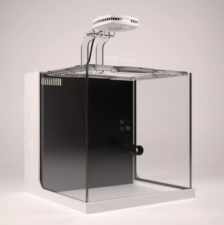 - Des nanos aquariums récifaux cubiques de 40 cm de côté tout équipés : cuve, éclairage AquaIllumination Hydra 16HD, pompe de circulation Tunze comline 900, écumeur utilisant la pompe du Tunze 9004 DC, refuge à algues avec éclairage intégré, support pour tuyaux de dosage