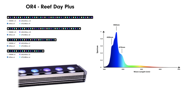 - Reef Day Plus : mélange de blanc, bleus, UV et violets