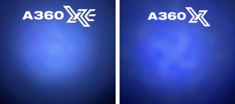 La Kessil A360XE dispose des dernières générations de composants, permettant une amélioration de 15% de son intensité, tout en gardant la même consommation électrique (90W à pleine puissance) que le précédent modèle A360X. Pour cela, Kessil a amélioré sa matrice de LED ultra dense (« Dense Matrix LED »). Outre l’intensité, le mélange des couleurs et la diffusion de la lumière se voient également améliorés comme le montre le visuel ci-dessous.
