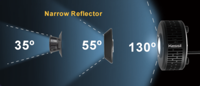 Aussi, ce nouveau modèle dispose d’un angle d’émission de lumière plus large, sur 130°. Il est recommandé pour une surface de 60 cm x 60 cm pour un aquarium récifal mixte, ou 50 x 50 cm pour des coraux SPS plus exigeants. Cette diffusion plus large réduit les zones d’ombrages. Des réflecteurs vendus séparément permettent de concentrer le flux lumineux à 55° ou 35°. Cela peut servir pour les aquariums très hauts ou éclairer une zone difficilement accessible avec un éclairage à flux plus large. Ou encore, ces réflecteurs peuvent être utiles pour disposer le spot Kessil beaucoup plus haut que le bac, au plafond par exemple, et rendre l’aquarium plus esthétique, sans rampe suspendue au-dessus. La lumière étant concentrée, elle sera dirigée vers le bac et n’éclairera pas toute la pièce.