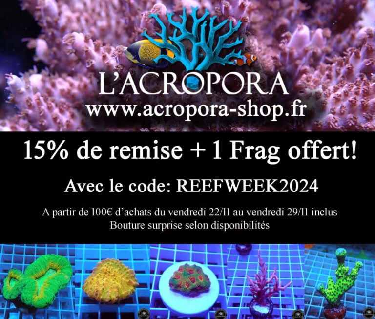 Tout est dit dans le visuel ! Pour tout achat de plus de 100€, profitez de 15% de réduction et recevez un frag supplémentaire mystère (selon les stocks) en ajoutant le code REEFWEEK2024 en passant votre commande.