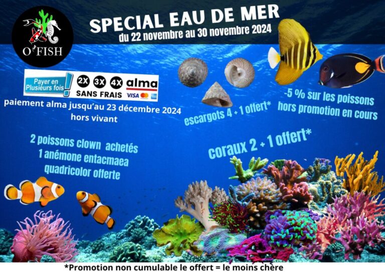 Profitez durant toute la semaine d’une remise de 20% sur toutes les coraux (sauf exceptions), et de -15% sur tous les poissons. A cela s’ajoutera une offre spéciale chaque jour.