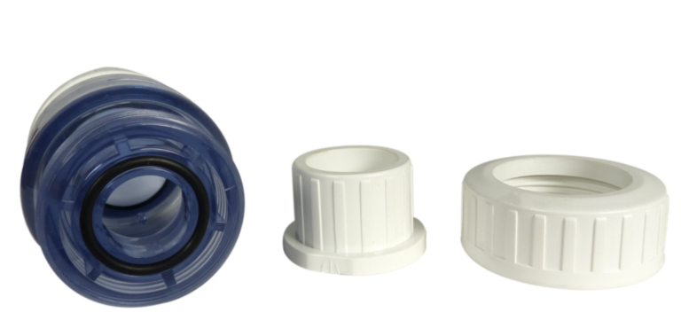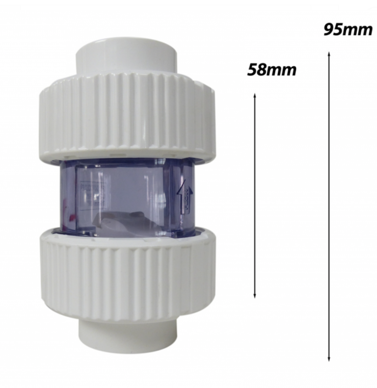 Le nouveau modèle proposé est à coller sur un circuit en tuyau PVC de 25 mm. Il est plus compact, avec ses 95 mm de long contre les 137 mm du modèle précédent proposé par la marque. Ce clapet est capable de fonctionner en condition PN10, soit une pression nominale de 10 bars. Une flèche indique clairement et simplement le sens de circulation. Grâce à ses raccords-unions avec joints en silicone, il est possible de l’entretenir / le changer si besoin sans avoir à modifier ses collages.