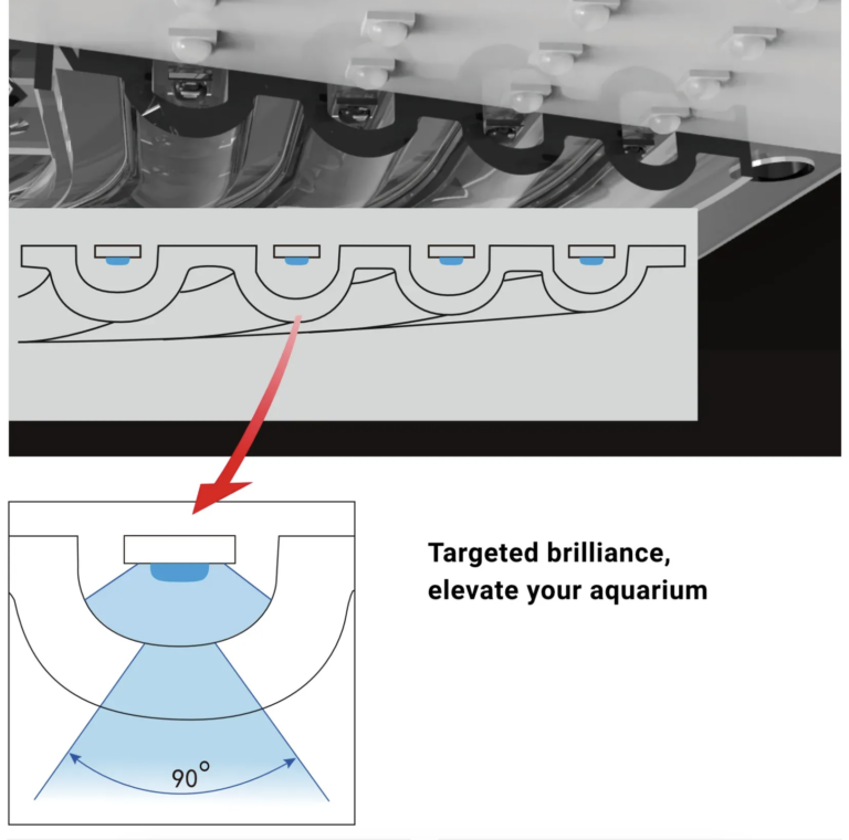 Côté optique, c’est également une innovation, avec une sorte de « gouttière » de réflexion qui concentre le flux de chaque LED en cône de 90°. Ainsi, la puissance produite est directement dirigée dans le bac.