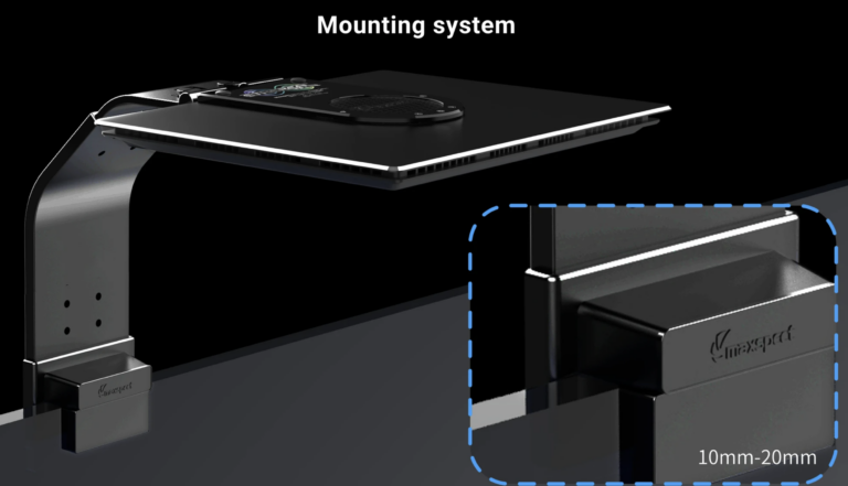 Côté fonctionnalité des plus pratiques : la possibilité de la lever à 90° au-dessus du bac et donc, libérer l’accès à la largeur de l’aquarium. Et pour couronner le tout, en faisant cela, la Maxspect Ethereal Infinite s’éteint pour ne pas éblouir l’aquariophile en action.