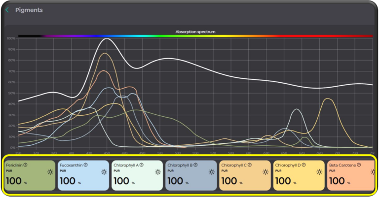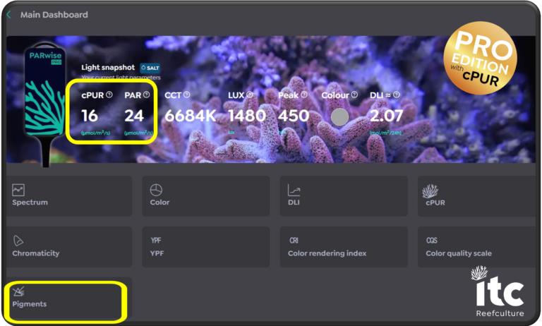 Pour cela, ITC a développé récemment le PARWise PRO, un appareil de mesure de la quantité et la qualité de la lumière. En plus des mesures devenues plus « classiques » telles le PAR (quantité de lumière activant la photosynthèse par m2 par seconde) et le DLI (quantité quotidienne de lumière), ITC a voulu aller plus loin en intégrant les connaissances sur l’absorption de la lumière par les différents pigments présents chez nos coraux.