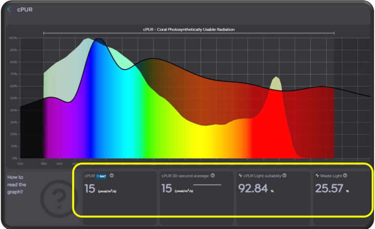 - le CPUR moyen sur 30 Secondes (cPUR 30-second average) : la quantité de lumière utilisable par les coraux en 30 secondes et en tenant compte de la turbidité, de la réflexion de l’eau de l’aquarium notamment