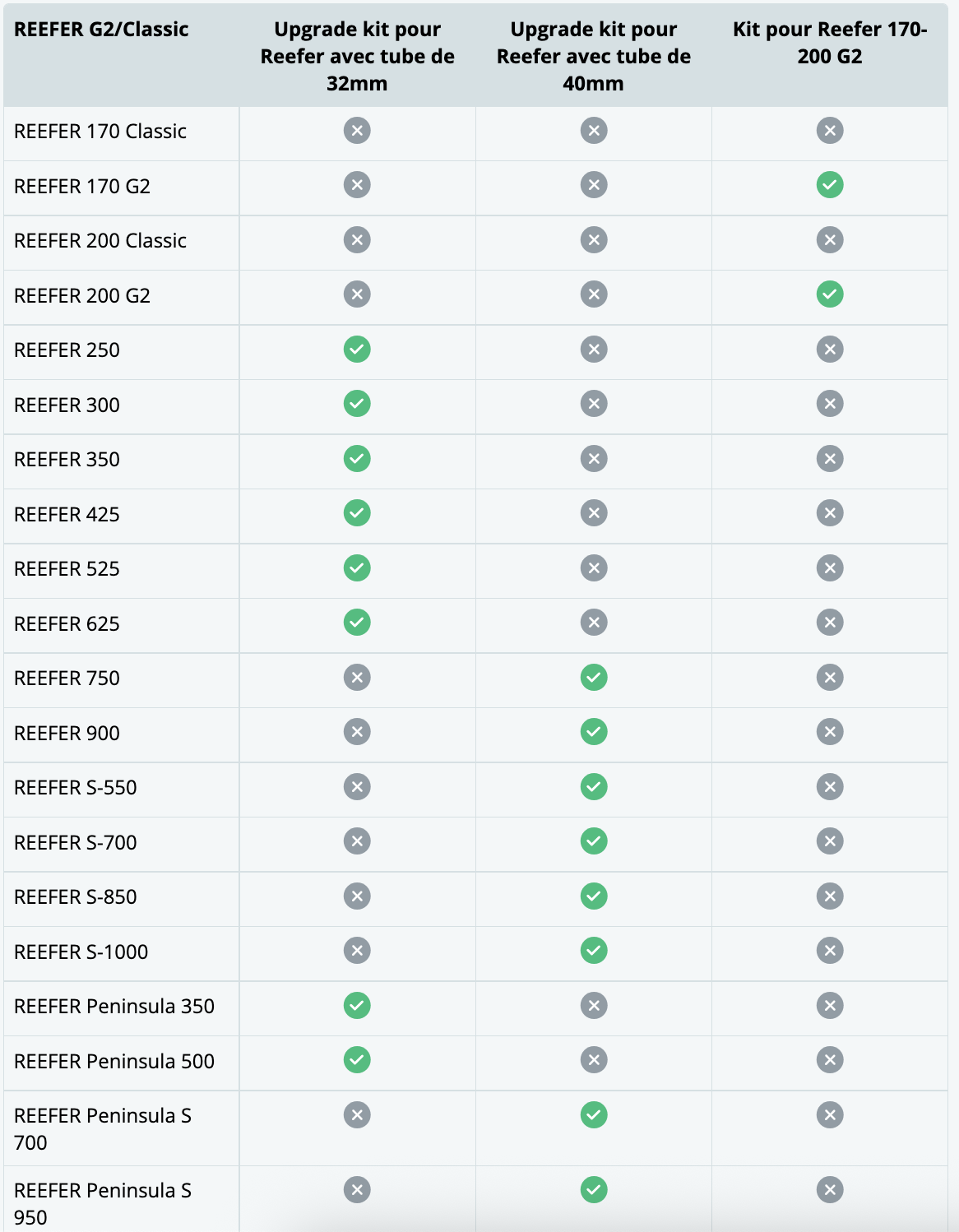 Seuls les Reefer G1 170 et G1 200 ne pourront pas être équipés de cette nouvelle vanne. Voici le tableau de rétrocompatibilité des différents kits de Red Sea ReefGate.